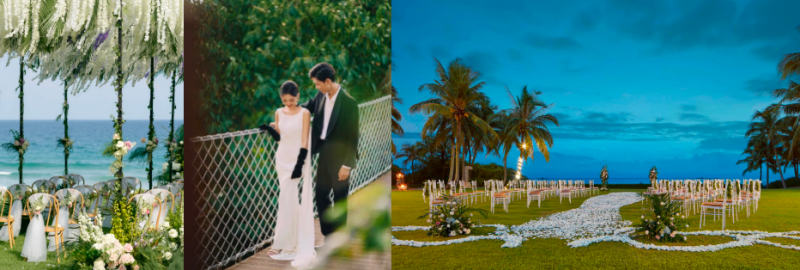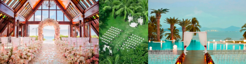 从左至右:三亚亚龙湾万豪度假酒店的“海之恋”婚礼堂、三亚海棠湾JW万豪度假酒店的椰林草坪、三亚山海天大酒店傲途格精选的玻璃水台